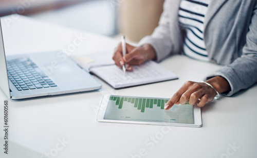 Data, tablet and accountant working on graph results or planning company finance performance in an office. Woman, hands and financial advisor doing a growth analysis of a startup using statistics