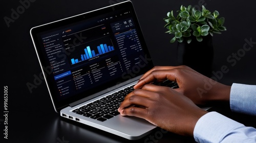 Data-Driven Decisions: Hands of a businessman analyze financial data on a laptop, showcasing the digital world of modern business.