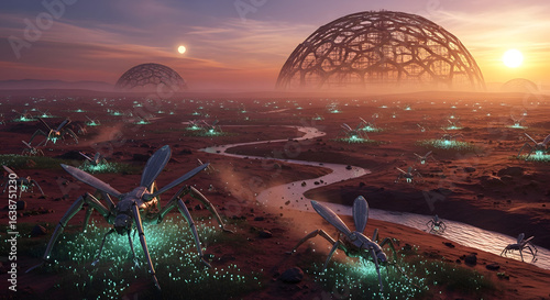 creation, futuristic, technology, science fiction, hope, future, space, exploration, planet, alien, landscape, drone, robot, life, colonization, ecosystem, dawn, cinematic, genesis