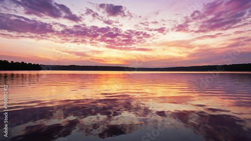Dawn over a serene lake; golden light illuminates the sky in pink and lavender hues with wispy clouds.