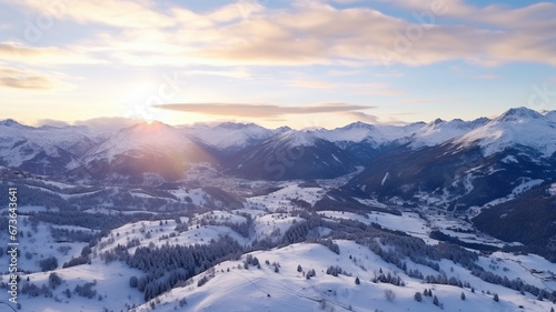 Dawn over snow-capped mountain peaks.