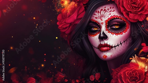 day of the dead, promotion, banner, girl, make-up, skull, traditional, festive, celebration, colourful, dark background, marketing, advertising, art, face paint, halloween, cultural, event, elegant, trendy, unique, decorative, occasion, special, beautiful, gothic, party, model, creative, artistic, illustration, style, ornate, pretty, feminine, vintage, image