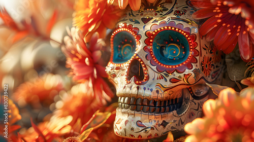 Day of the dead background with skull mask, candles and flowers, front view, close up. Holiday banner with dia de los muertos skull for postcard, poster, web site, greeting invitation. Copy Space.