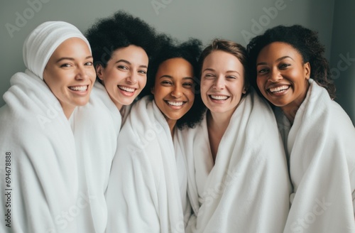 day spa, relaxation, woman, bonding, diverse, robe, wellness, friends, smiling, happiness, beauty, pampering, skincare, health, leisure, luxury, enjoyment, towel, together, friendship, care, facial, treatment, rejuvenation, serene, calm, cheerful, group, comfort, harmony, lifestyle, therapy, peaceful, glowing, social, radiant
