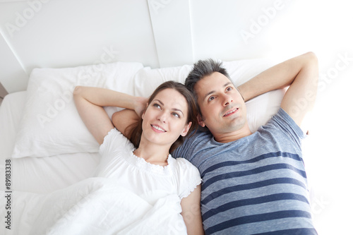 bed, couple, daydreaming, waking up, woman, man, pensive, mattress, morning, stretching, energy, smiling, rested, happy, beautiful, caucasian, relaxation, smile, happiness, lying, brunette, awake, fun, casual attire, resting, leisure, enjoying, relaxing, calm, chilling, comfortable, content, up high, pillow, bedding, blanket, lazy, dream, dreaming, husband, wife, thinking