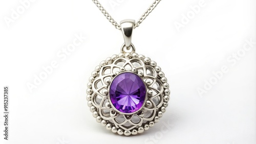 Dazzling purple gemstone pendant adorned with intricate silver filigree hangs delicately from a slender chain, radiating luxury and sophistication on a soft, white background.
