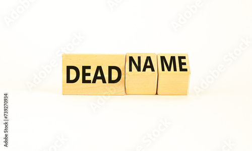 Deadname or name symbol. Concept words Deadname or Name on beautiful wooden blocks. Beautiful white table white background. Business, deadname or name concept. Copy space.