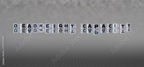 deadweight capacity word or concept represented by black and white letter cubes on a grey horizon background stretching to infinity