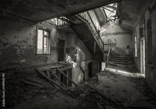 ruin, abandoned, decay, building, destruction, house, wreckage, greyscale, monochrome, architecture, interior, stair, hallway, old, damaged, crumbling, broken, forgotten, derelict, dilapidated, collapsed, ramshackle, deteriorated, desolate, gloomy, eerie, haunted, dust, debris, dark, shadow, light, contrast, texture, vintage, black-and-white, photo