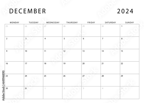 December 2024 calendar. Monday start. Monthly planner template. Vector design
