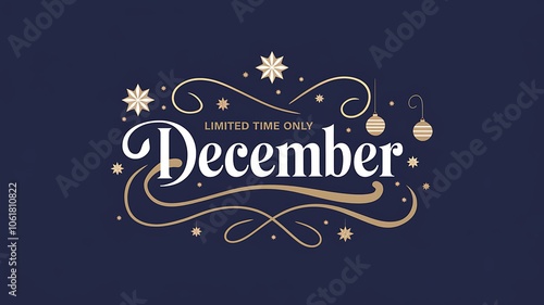 december, festive, typography, gold, star, ornament, calligraphy, holiday, season, winter, celebration, christmas, new, year, design, graphic, background, blue, white, illustration, decorative, elegant, ornate, lettering, text, banner, poster, card, greeting, happy, merry, limited, time, only