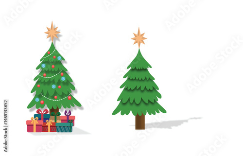 Decorated and Undecorated Christmas Tree with Star and Gifts Isolated on White Background