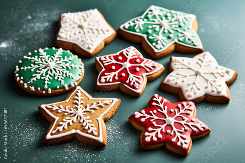 Decorated Christmas cookies spread on kitchen countertop isolated on a gradient background
