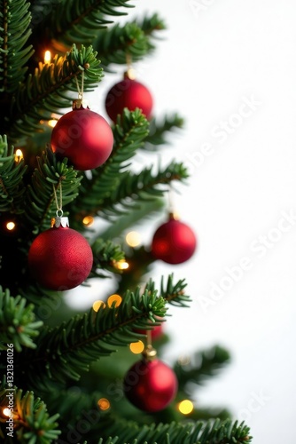 Decorated Christmas tree branch with ornaments and lights isolated on white background, Ornaments, Christmas decorations, Seasonal decor