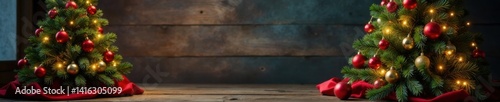 Decorated Christmas Tree on Wooden Background, Festive, Green Lights, Wooden Table