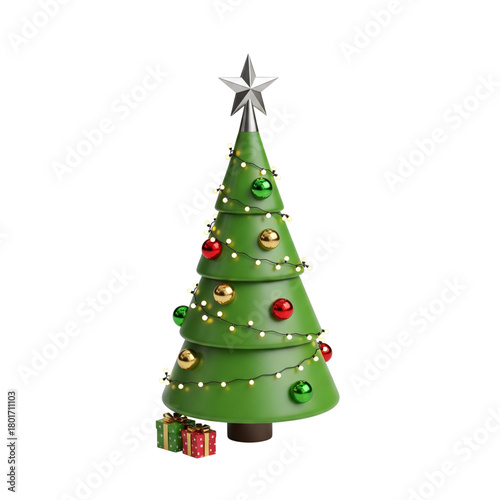 christmas, tree, decorated, holiday, winter, festive, ornament, light, star, gift, present, seasonal, celebration, evergreen, pine, fir, traditional, decor, decoration, holiday, isolated, transparent, background, cut-out, graphic, illustration, three-dimensional, render, digital, art, new, year, greeting, joyful, merry, bright, sparkling, glowing, green, red, gold, silver, season, ornate, wrapped