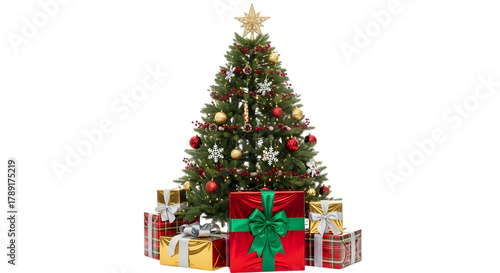 christmas, tree, decorated, ornament, light, star, gift, present, bow, ribbon, holiday, season, winter, celebration, festive, traditional, evergreen, pine, fir, green, red, gold, silver, sparkle, shiny, bright, illumination, christmas, surprise, unwrap, box, holiday spirit, seasonal, decoration, isolated, studio shot, cut-out, element, graphic, design, template