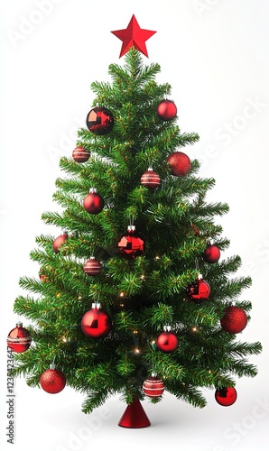 Decorated Christmas tree with red ornaments and star on white background, perfect for holiday projects