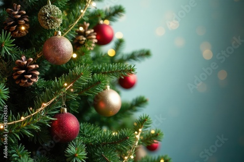 decorated evergreen tree with festive garland and pinecones, Decorations, Pinecones, Seasonal