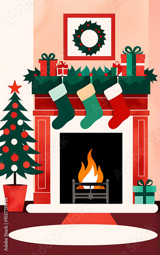 decorated fireplace hangs richly colored stockings intricate watercolor designs christmas time