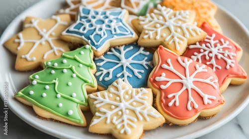 Decorated holiday sugar cookies plate of colorful Christmas cookies shaped like trees stars and snowflakes with intricate icing details
