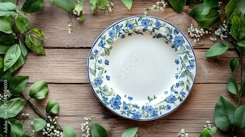 decorative, blue, floral, plate, green, leaf, wooden, rustic, table, empty, dish, transparent, dining, arrangement, background, kitchen, theme, white, design, porcelain, vintage, top, dinner, food, pattern, view, tableware, ceramic, isolated