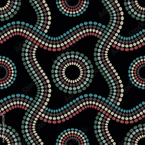 Decorative composition of wavy lines and intersecting dotted circles on a black background. Retro ethnic style design. Geometric dotty ornament. Seamless repeating pattern. Vector illustration.