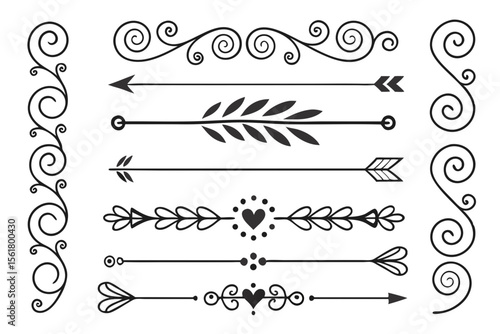 Decorative Divider Collection Featuring Elegant Floral Swirls, Curved Arrows, and Ornamental Line Borders in Hand-Drawn Black Vector for Invitations and Layouts.