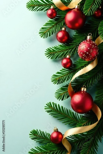 Decorative evergreen branch with ornaments and ribbons, Christmas decorations, pine tree branches