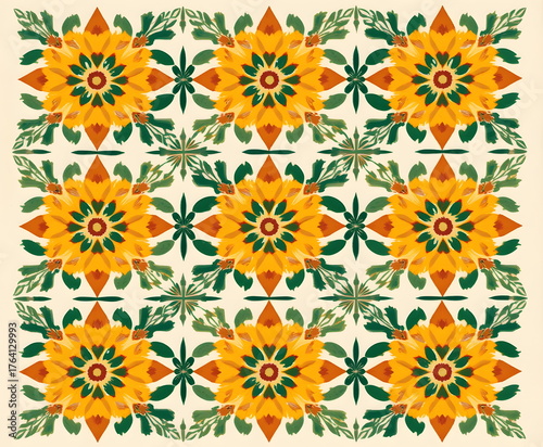 Decorative floral pattern with yellow flowers and green leaves in symmetrical arrangement
