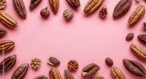 Decorative food flat lay highlighting cocoa pods and confectionery items on a smooth pink background