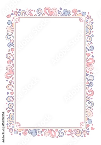 Decorative frame with pastel hearts swirls and floral elements on a white background perfect for invitation or greeting card design.