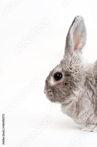 Decorative gray rabbit on a white background. Portrait of the muzzle on the side. Copy space. Vertical orientation. The concept of advertising products for animals