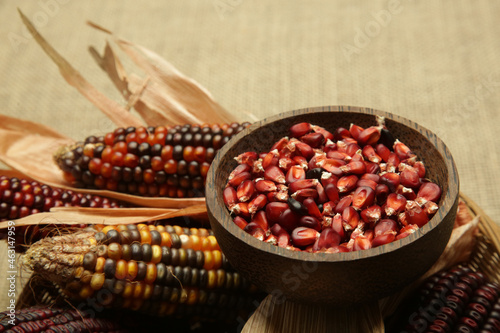 Decorative Indian corn seeds in bowl. Multi Colored flint corn on wooden background with copy space.