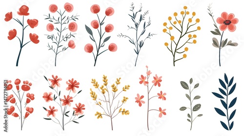 Decorative Set of Branches, Berries, and Flowers Line Art for Design Projects