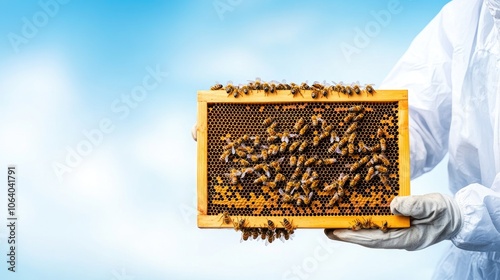 Dedicated beekeeper in protective suit tending to bees with a beehive frame against a bright sky