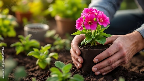 Dedicated Gardener Carefully Planting Vibrant Flowers, Showcasing a Deep Connection with Soil and the Art of Cultivation
