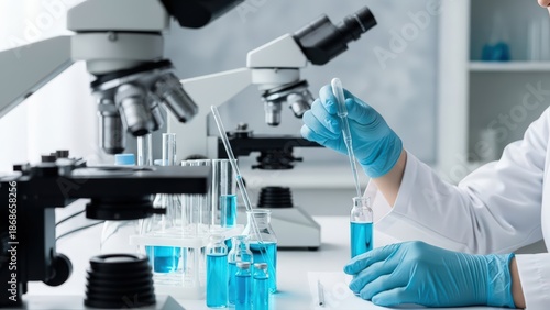 scientist, laboratory, research, biochemical, sample, experiment, microbiology, science, medicine, medicals, cosmetic, development, pharmaceutical, viral, discovery, chemistry, biology, analysis, health care, technology, innovation, precision, study, test, solution, microscope, equipment, professional, modern, clean, white, blue, health, work, future, progress, liquid, glove, pipette, glassware, flask, beaker, tube, bottle, safety, laboratory, sharpened, detail