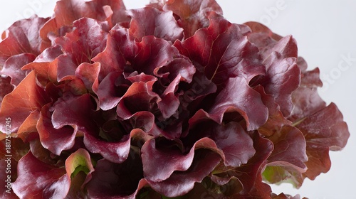 Deep crimson leafy vegetable displays intricate ruffled textures against a pale background