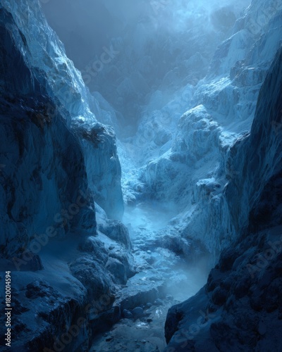Deep glacier canyon glowing with icy blue light and textured frozen walls.