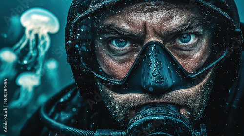 diver, underwater, adventure, mask, jellyfish, bioluminescence, ocean, exploration, marin, water, droplet, closeup, mystery, surface, blue, depth, aquatic, nature, surreal, encounter, high-coloured, illumination, habitat, sea, environment, wildlife, diving, unknown, science, discovery, beauty, dark, fluid, tranquil, captivating