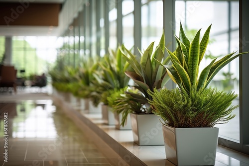 Defocus Office plant and glass wall in the lobby area. Generative AI