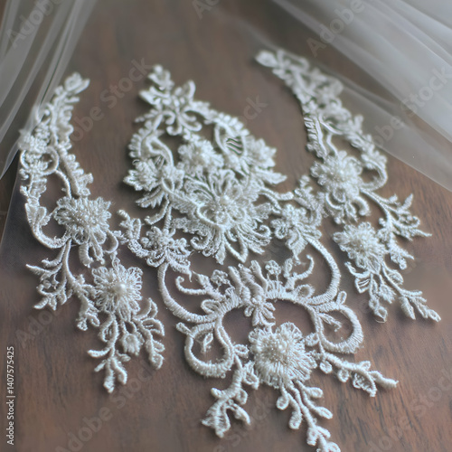 lace, floral, pattern, white, cream, embroidery, bead, delicate, texture, design, sewing, fabric, detail, elegant, luxury, accessory, craftsmanship, hand-made, bridal, wedding, dress, apparel, textile, patterned, ornate, decorative, wood, wooden, surface, closeup, macro, jewellery, stitching