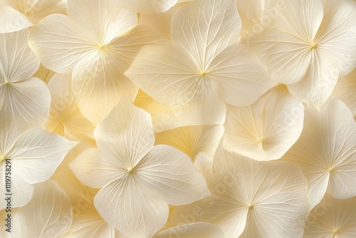 Delicate Arrangement of Soft Cream Hydrangea Petals Creating a Gentle Textured Background for Artistic and Floral Design Projects