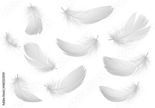 Delicate arrangement of soft white feathers floating gently against a clean, bright white background