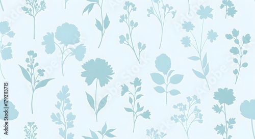 Delicate blue floral silhouette pattern on a light background, botanical illustration