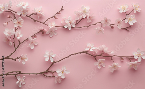 Delicate cherry blossoms on thin branches against a soft pink background.