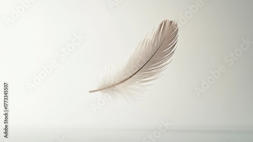 Delicate feather floating in the air, capturing soft light and showcasing its fine details