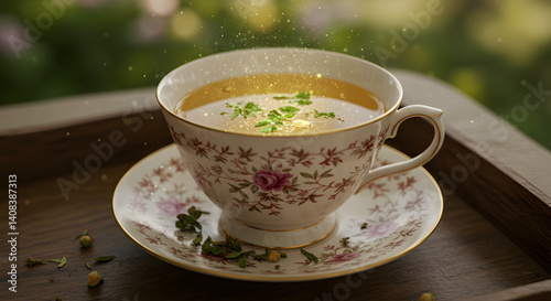 Delicate Floral Teacup Presenting Aromatic Herbal Tea and Subtle Golden Sparks