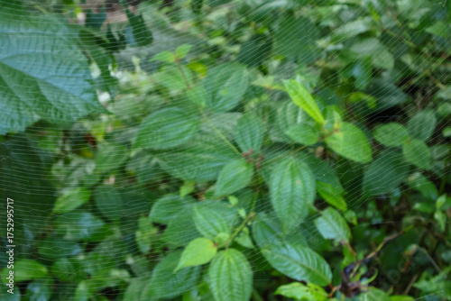 Delicate golden orb-weaver spider web glimmers almost invisibly over dense green leaves in Vagamon, Kerala, India. Soft natural light enhances the wild, untouched rainforest setting